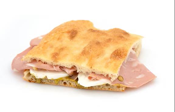 The schiacciate supreme. The most popular sandwich among customers, and for good reason. It’s composed of mortadella di bologna, buffalo mozzarella, and pistachio cream. The latter ingredient, a grainy green condiment with the consistency of ranch dressing, was primarily what set this sandwich apart from its peers, but it also had the added distinction of being the only sandwich in the display case to feature mortadella, a bright pink deli ham studded with cubes of fat and even more pistachios.